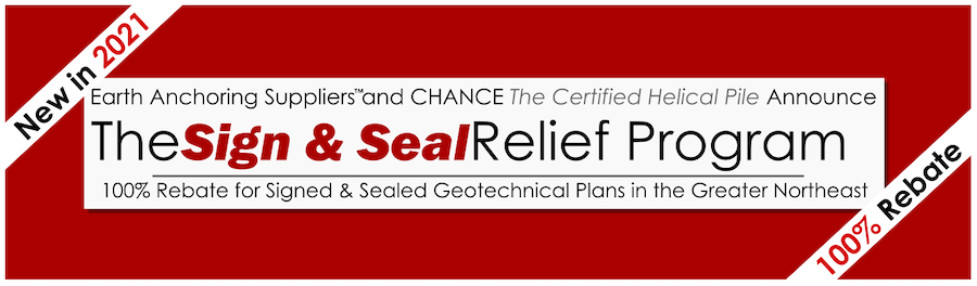 Earth Anchoring Suppliers and CHANCE The Certified Helical PileTM are continuing their partnership to launch the expanded 2021 Sign & Seal Relief ProgramTM to assist deep foundation contractors in the Northeast. They have expanded the program to include New York, New Jersey, Maryland, Delaware, Eastern Pennsylvania, Connecticut, Rhode Island, Vermont, Maine, West Virginia, and Washington DC.