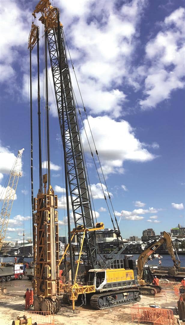 This is not the first project of the Australian subsidiary of BAUER Spezialtiefbau GmbH in Sydney Harbor area. From January 2012 to June 2013, Bauer Foundations Australia, together with a joint venture partner, constructed the foundation for three large office towers and several smaller residential and office complexes on the neighboring property. During that project, it was discovered that the top soil stratum of the former container terminal site is composed of a wide variety of back-fill material, such as brick, concrete and rubble as well as parts of old port facilities and dams. Rock with strengths of up to 100 MPa, depending on the depth, is found beneath a further layer of clay, sand and gravel.