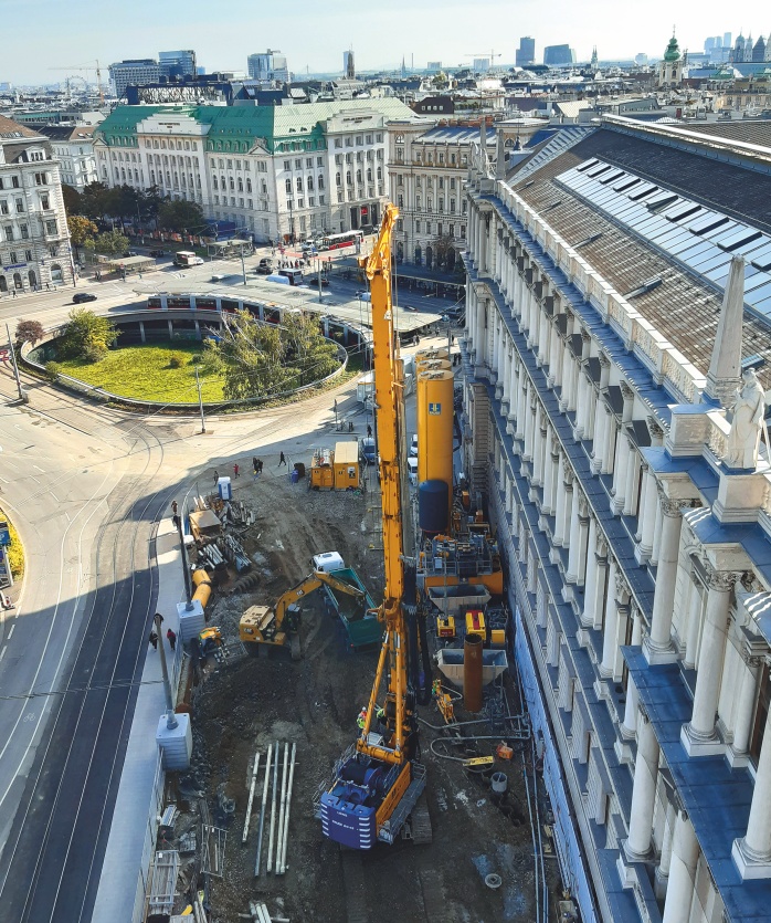 BAUER Spezialtiefbau Ges.m.b.H., the Austrian subsidiary of BAUER Spezialtiefbau GmbH, was commissioned by the joint venture U2xU5, comprising the companies Swietelsky AG, HOCHTIEF Infrastructure GmbH and HABAU Hoch- und Tiefbaugesellschaft m.b.H., to construct approximately 35,000 m of piles with diameters of 620 mm, 880 mm, 1,180 mm and drilling depths of up to 61 m for nine shafts and station structures in the middle of the city center of the Austrian capital (contract sections U2/22 & U5/2). For this purpose, up to five large rotary drilling rigs are being mobilized in the period from April 2021 to fall 2022.