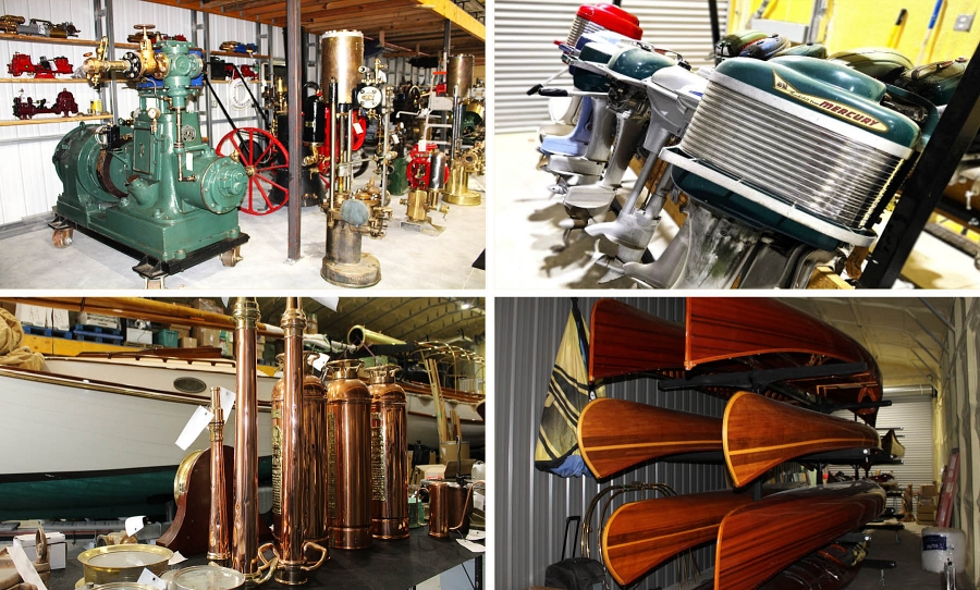 The auction includes a wide range of items such as steam-powered machinery, vintage wooden boats, navigation instruments, boat motors, pumps, tools, and marine-related antiques. The collection reflects decades of maritime history, with equipment tied to the evolution of steam-powered operations and craftsmanship.