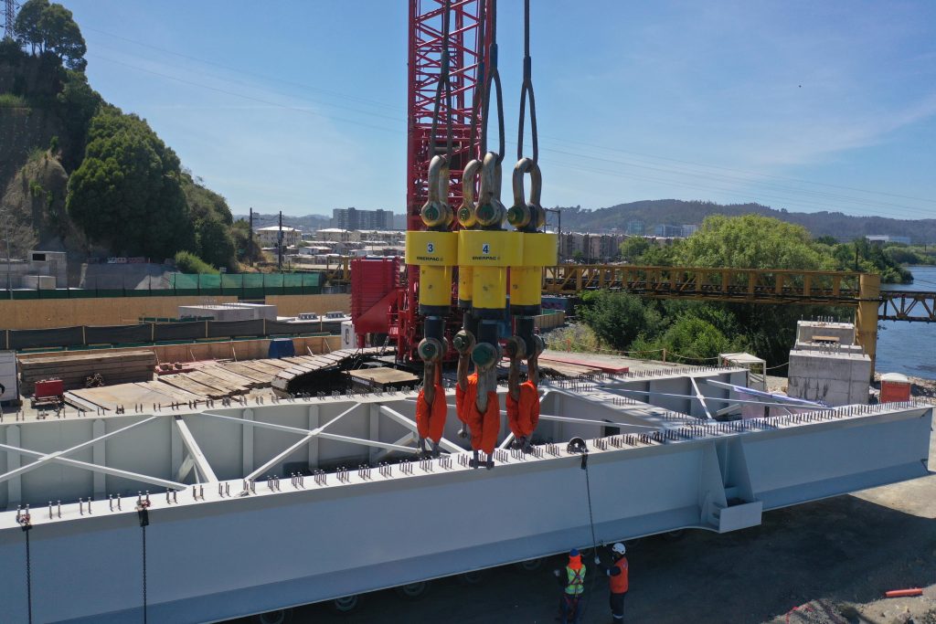 Leading Americas heavy lift contractor, Tecnogruas, has used an Enerpac SyncHoist synchronous hoist system to lift and precisely position concrete bridge beams for a new railway bridge over the Biobío river in central Chile. The SyncHoist allowed Tecnogruas to use a single crane for the tricky job of installing asymmetric-shaped bridge beams over a nearby commuter highway and rail track.