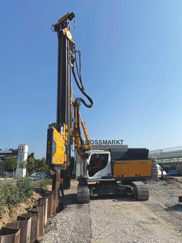 The system has already proven to be effective in practice through multiple applications, for example construction of an underground garage in the German city of Berlin last year, where an RG 19T with integrated sheet pile assistant was used. The task: securing a slope, and then later the excavation pit, using double U profiles with a length of 12 m. The fact that an RG without assistant was initially used for this project, before commissioning of an RG 19T with the new system, means that direct comparison was possible: threading in the sheet piles took just a fraction of the time that was previously required. The sheet pile walls only required slight preparation.
