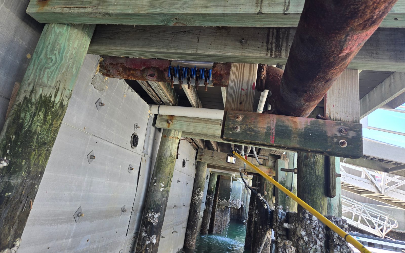 The SPiRe®+ system, developed by Professor Ehsani, was selected as the repair method. SPiRe®+ consists of lightweight fiber-reinforced polymer (FRP) panels designed for rapid installation and long-term durability in harsh marine environments. The panels are resistant to corrosion, easy to transport and handle, and capable of being installed underwater without the need for costly cofferdams.
