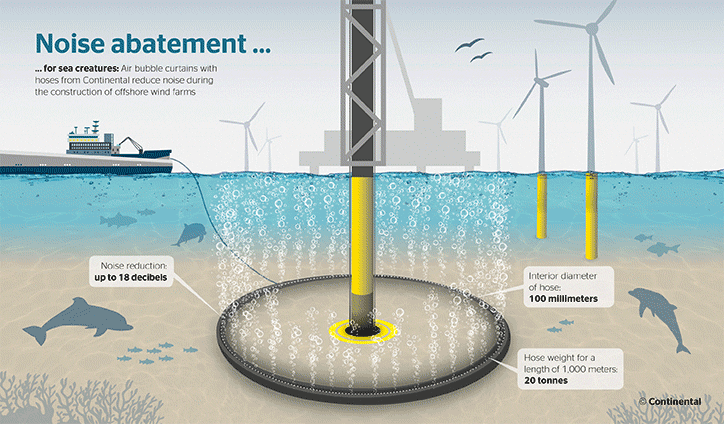 CT: Offshore construction work, such as the anchoring of foundations for wind turbines, creates an enormous amount of underwater noise. Sound intensity can reach 180 dB at source during pile driving – equivalent of a rocket launch. The Big Bubble Curtain Hose reduces this noise level.