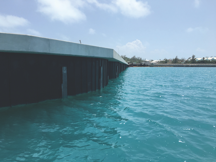 A new seawall was needed to optimize the fill quantities and to create a new quay wall within the Dockyard’s basin. The seawall, measuring approximately 1350 linear feet, was needed on two sides of the land reclamation area. A traditional tied-back combi-wall was initially proposed for the site, taking into consideration the height of the wall and the variable soil conditions at the site. However, because of deep layers of soft marine sediment and a zone of exposed limestone bedrock, the combi-wall system was an expensive solution requiring staged construction and underwater pile socketing.