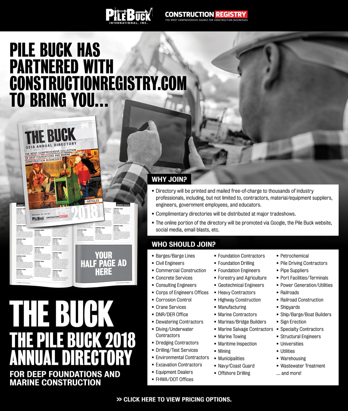 Pile Buck has partnered with ConstructionRegistry.com to bring you THE BUCK: PILE BUCK 2018 Annual Directory for deep foundations and marine construction.