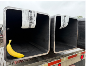 For this project, the spuds were 75-foot lengths of 18″ square tubing, shown above with a banana for scale. The material was supplied as two 48-foot sections and one 55-foot section, with a total shipment weight of 25,831 pounds.