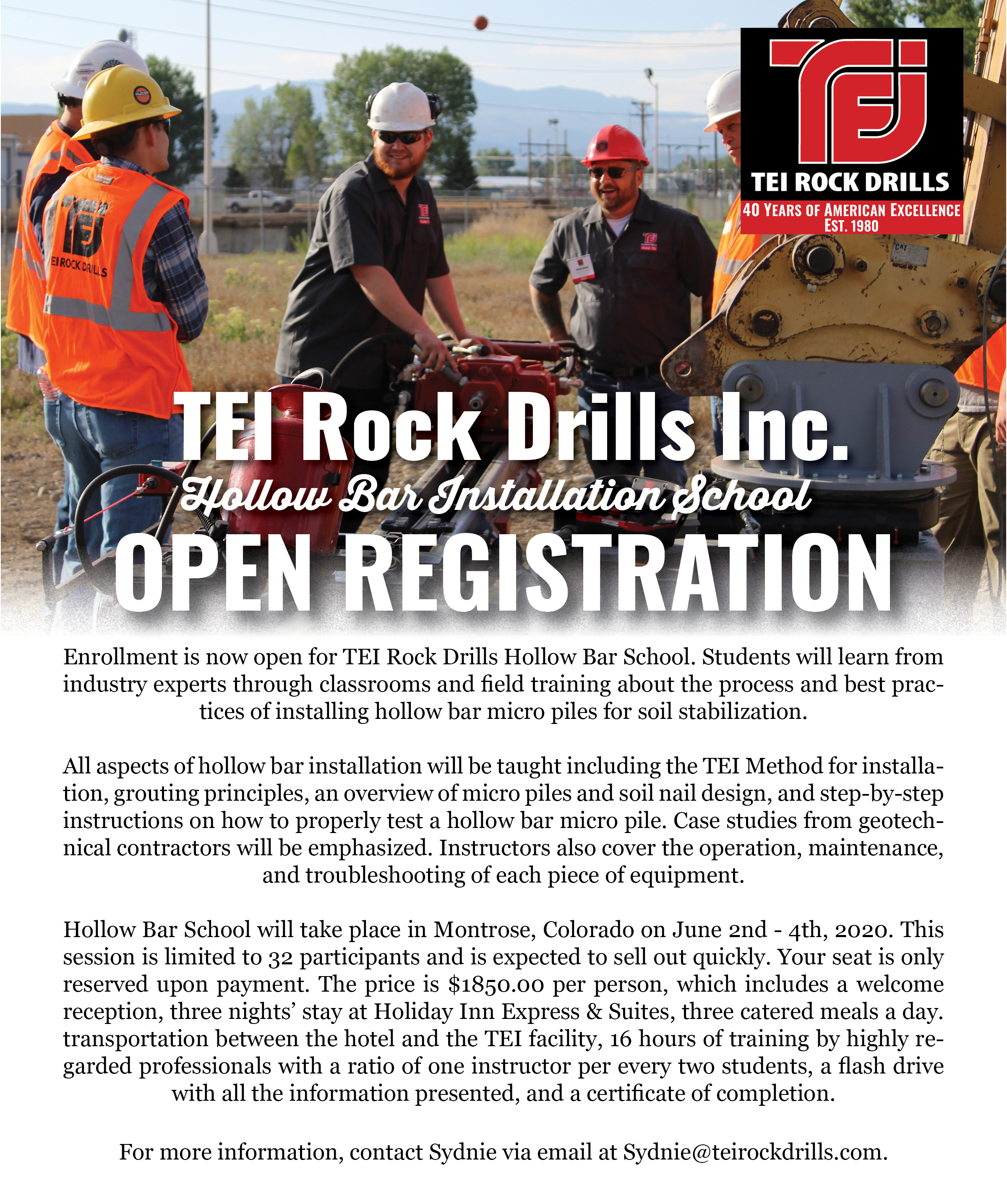 Students will learn from industry experts through classrooms and field training about the process and best practices of installing hollow bar micro piles for soil stabilization. All aspects of hollow bar installation will be taught including the TEI Method for installa­tion, grouting principles, an overview of micro piles and soil nail design, and step-by-step instructions on how to properly test a hollow bar micro pile. Case studies from geotech­nical contractors will be emphasized. Instructors also cover the operation, maintenance, and troubleshooting of each piece of equipment.